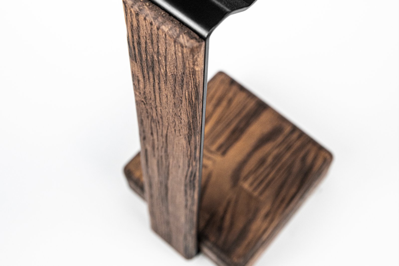 Stovui naudotos tik natūralios medžiagos – plienas ir ąžuolo mediena, stovas nuo A iki Z pagamintas rankomis.