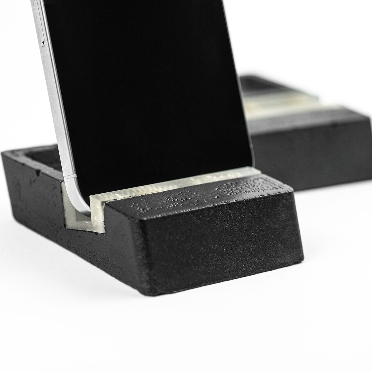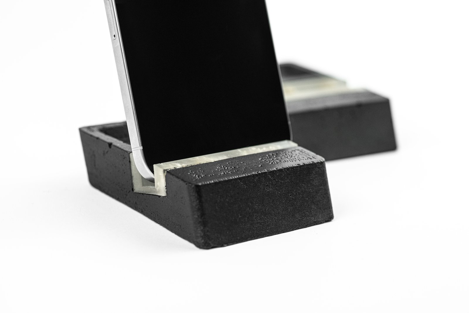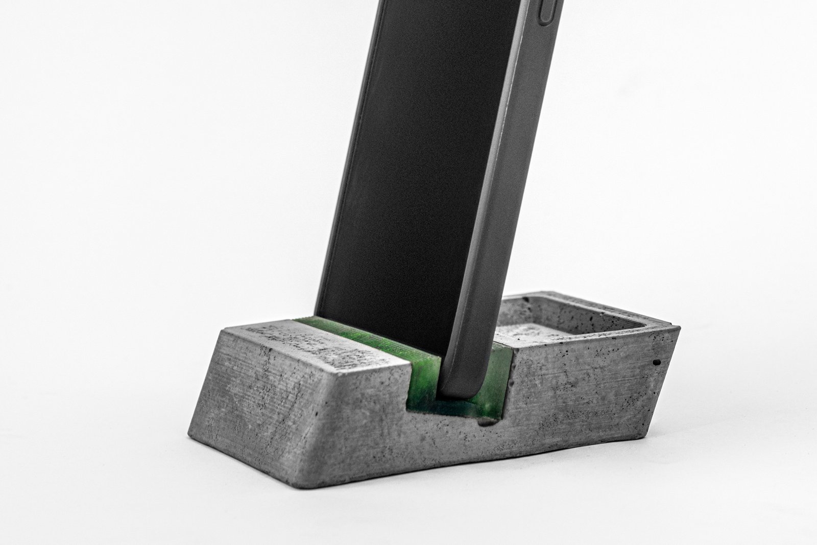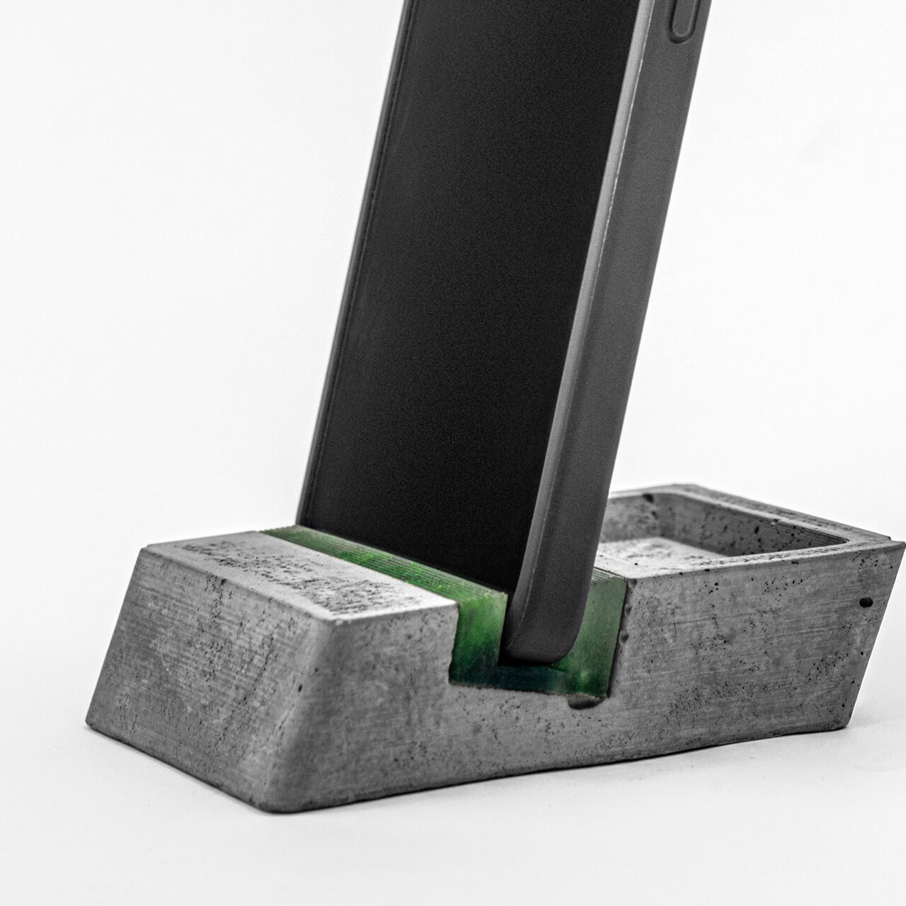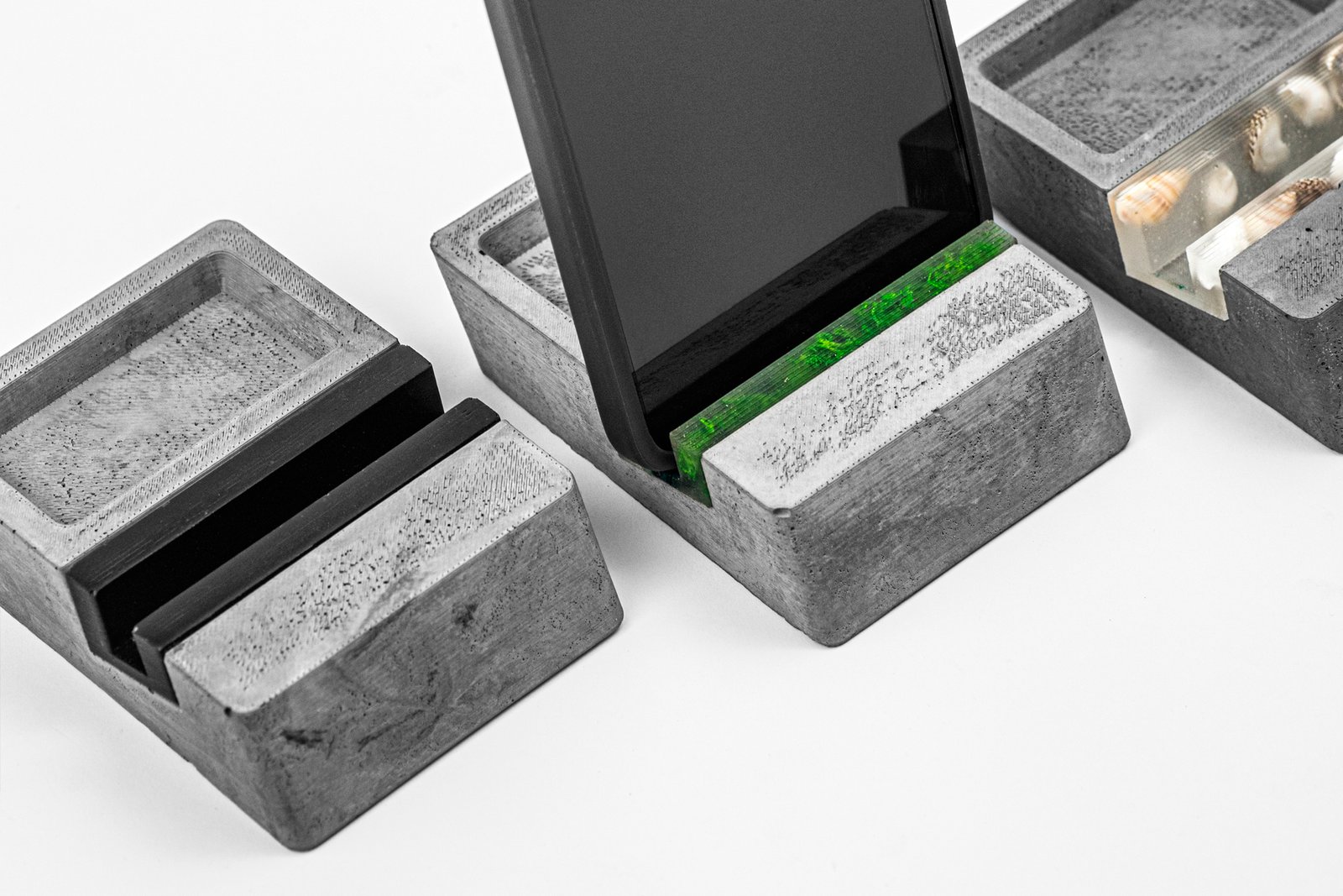 Betoninis ir epoksidinės dervos išmaniojo telefono laikiklis – rankų darbo stovas, skirtas telefonui laikyti horizontalioje ir vertikalioje padėtyje Centrinė dalis pagaminta iš epoksidinės dervos (pavyzdžius žiūrėkite nuotraukose), galime pagaminti bet kokios spalvos epoksidinę dervą. Kiekvienas stovas yra unikalus, struktūra, spalva, įbrėžimai, smulkūs burbuliukai – visa tai dėl betono ypatybių.
